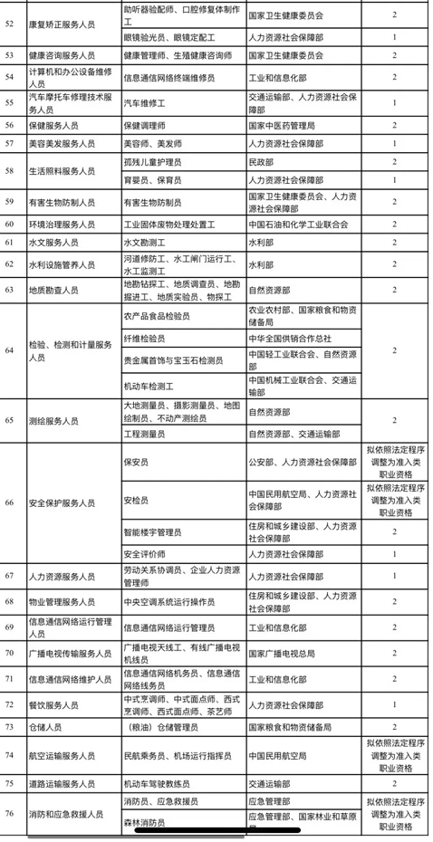 为贯彻落实2019年12月30日国务院常务会议精神,拟分批将水平评价类技能人员职业鉴定退出目录,其中:人力资源社会保障部门和有关部门组织实施的14项职业鉴定(涉及29个职业)拟于9月30日前第一批退出;其他部门(单位)组织实施的66项职业鉴定(涉及156个职业)拟于12月31日前第二批退出;与公共安全、人身健康等密切相关的职业(工种)拟依法调整为准入类职业鉴定(具体安排详见附件)。