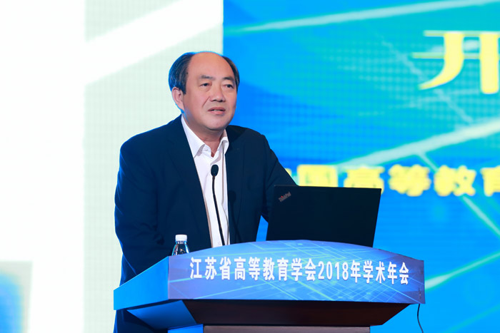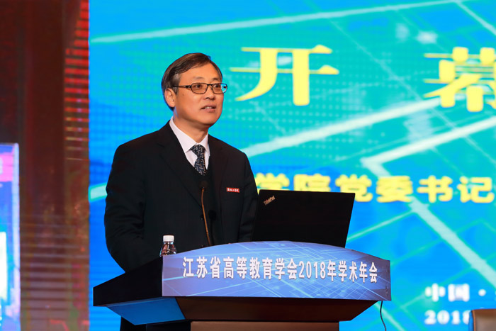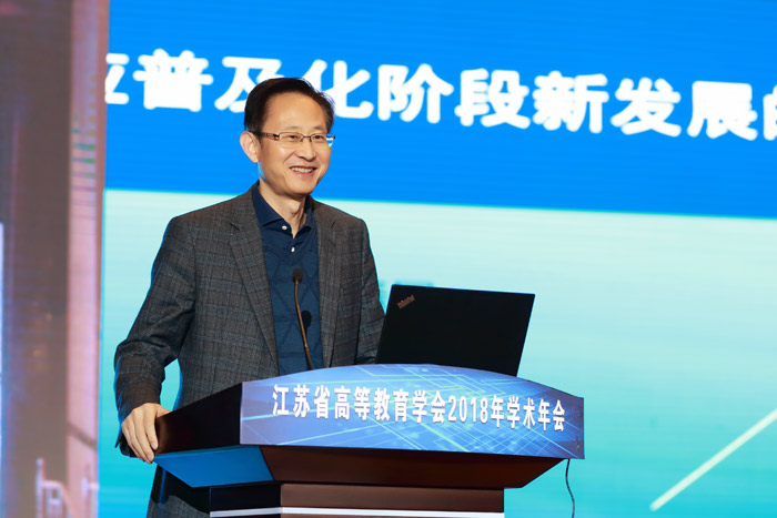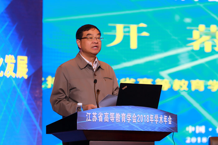 开幕式后,江苏省教育厅副厅长王成斌研究员和华东师范大学教育学部主任袁振国教授作主旨学术报告,江苏省高等教育学会副会长、江苏开放大学校长兼党委副书记崔新有教授主持。王成斌以《新时代江苏高等教育的挑战与变革》为题,结合当前 教育工作会议精神和习近平总书记有关高等教育论述,把握了当前高等教育发展的国内外形势与任务。报告回顾与总结江苏高等教育40年发展道路,展望当前我省高等教育面临的新矛盾,提出了新阶段推进江苏高等教育迈向高质量发展的新举措。袁振国以《适应普及化阶段新发展的未来高等教育》为题,从宏观视角分析了高等教育发展的客观规律,指出了普及化阶段高等教育将面临的问题。两个报告高屋建瓴,为普及化阶段高等教育发展提供了思路。江苏省高等教育学会副会长、江苏开放大学校长兼党委副书记崔新有校长主持了学术报告。