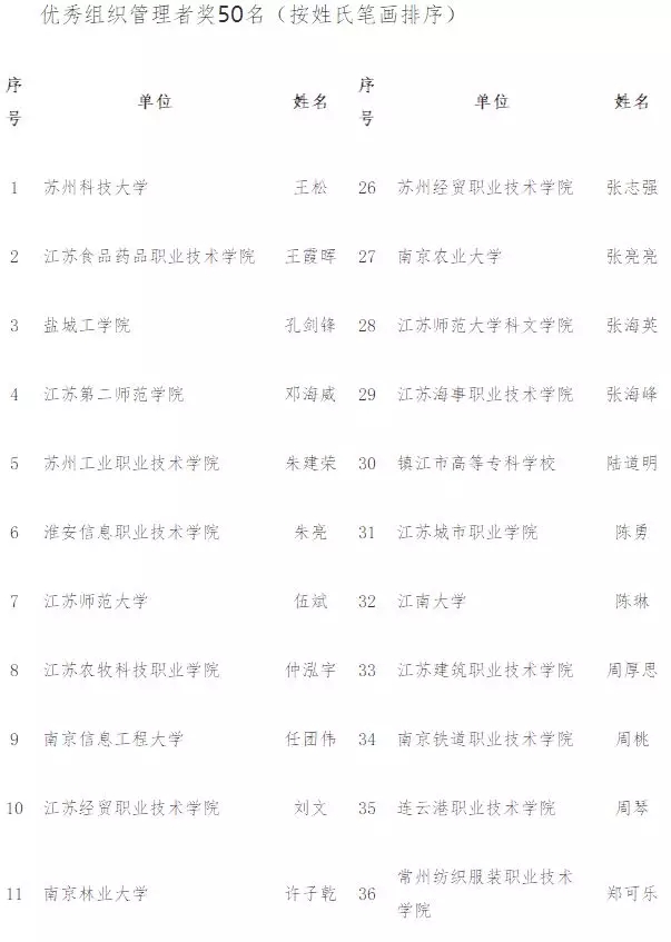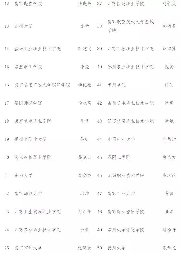 专科组:江苏工程职业技术学院、江苏建筑职业技术学院、江苏农牧科技职业学院、江苏食品药品职业技术学院、江苏信息职业技术学院、南京交通职业技术学院、苏州农业职业技术学院、苏州市职业大学、无锡职业技术学院、镇江市高等专科学校。