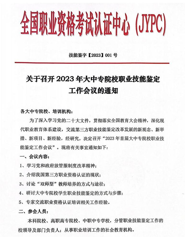 为了深入学习党的二十大文件,贯彻落实全国教育大会精神,深化现代职业教育体系建设,交流第三方职业技能鉴定改革发展的新观念、新举措、新项目、新经验,经研究,决定召开“2023年首届大中专院校职业技能鉴定工作会议”。现将有关事宜通知如下: